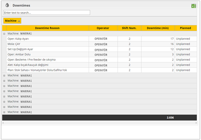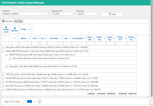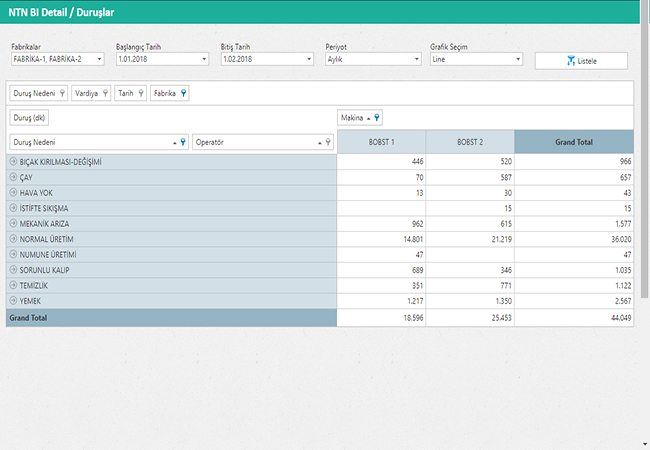 Tüm fabrikaların Operatör, Makina, Duruş Nedeni bazında Duruş sürelerini gösteren dinamik rapordur
