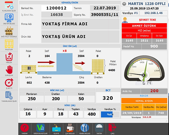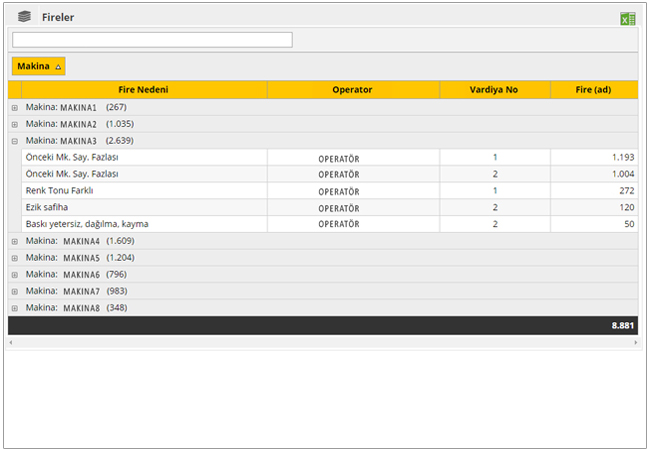 Makinaların Vardiya Amiri, Operatör, Vardiya bazında gösteren dinamik rapordur