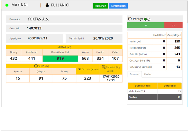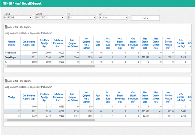 Makinalarının Hedef ve Gerçekleşen üretim bilgilerini gösterir