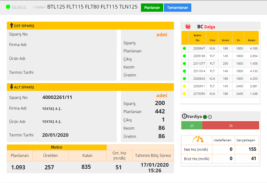 Üretim sırasında anlık Bobinlerin bilgilerini içerir