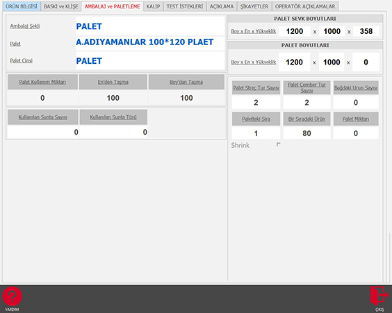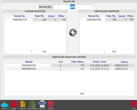 Üretim için uygun ve okutulan Paletlerin işlemleri yapılır.