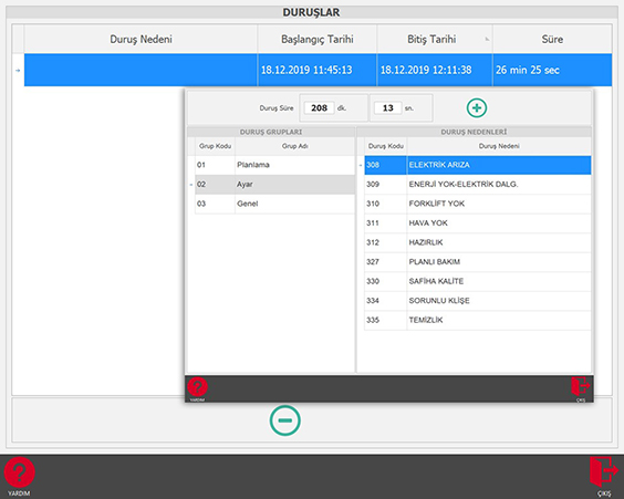 Üretim Sırasında oluşan tüm duruşların girildiği ekrandır