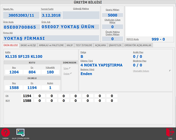 Ürünün Planlama Sipariş, Rota, Kalıp, Baskı Klişe, Operatör ve Şikayet bilgilerini içerir